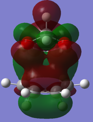 In figure 4, it can be seen that the HOMO of ethene and LUMO of butadiene also overlap to form new molecular orbitals as they are close enough in energy to interact and they are of the same symmetry. Figure 4 displays the HOMO and LUMO of the transition state which shows that the reaction pathway has a normal electron demand. This is because the reaction proceeds via the HOMO of the electron rich butadiene and the LUMO from the electron deficient ethene. Proof of this is because the shapes and phases of the transition state orbitals are equivalent to the combination of these two orbitals. The sizes of the MO also correlate with this type of reaction as figure 10 shows that butadiene has a larger contribution to the bonding MO. This shows that the HOMO of butadiene is lower in energy, directly correlating with normal electron demand reactions. The transition state is defined as the point of highest energy on a reaction coordinate. Therefore the MOs that are formed as a result of the overlap at the transition state must be higher in energy than the reactant molecular orbitals. This is displayed in figure 4.