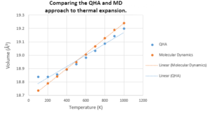As previously mentioned, the MD simulation accounts for the ions of the lattice to move in all 3 dimensions. On the other hand, the QHA approach only describes ionic motion in a single dimension. As a result, the thermal expansion, at high temperatures, of the MD cell causes a more distorted geometry of the lattice, which should induce a larger cell volume, than that predicted by the QHA model. This claim arises from the two gradients in Figure 16. At temperatures larger than 1000 K, the MD cell volume looks as if it’ll surpass the QHA cell volume.