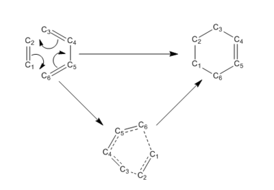 The Bond lengths of the Transition state reflect the stage at which the reaction is very well as the newly formed single bond of C2-C3 and C6-C1 are the longest as they being newly formed. These are the only once that have a bond length larger than that of the Van der Walls radius of carbon seen in table 2. However the length is less than twice the VDW radius of C, which means that there is a orbital interaction between the atoms.