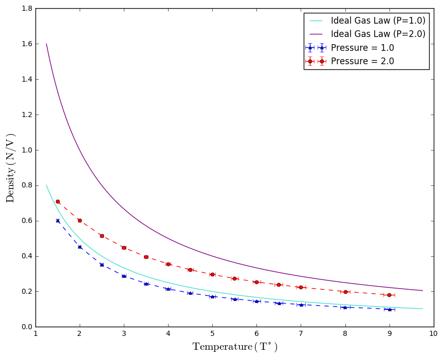 2 sets of simulations were executed at under pressure of 1.0 and 2.0. Temperature and pressure of simulation were controlled by a thermostat and a barostat to ensure simulation is in the NpT ensemble. After performing 100000 runs per simulation, a final averaged quantity of density, temperature and pressure were calculated from the average of 1000 averaged values of every 100 repeats, as well as the corresponding standard error values. Density against temperature plot at both pressure conditions were compared to the Ideal Gas Law and vand der Waals equation of state.