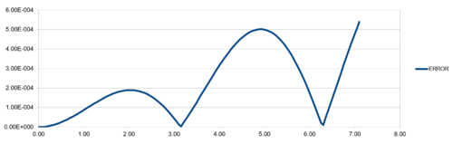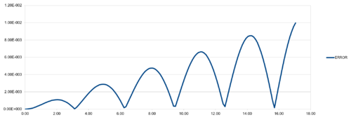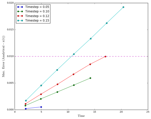 Regarding the difference between "ANALYTICAL" and calculated values, amplifying periodic patterns were observed. Maxima of each loop were selected and plotted as shown in Figure 13. It is observed that error values increases with timmestep and length of simulation runtime. The acceptable timestep that satisfy within 1% error is 0.12(max. percentage error is 0.96%).