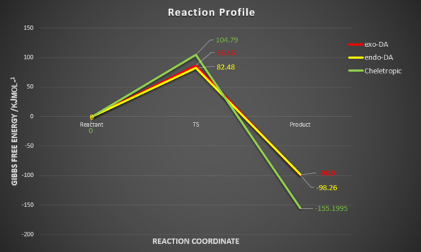 Calculate the activation and reaction energies (converting to kJ/mol) for each step as in Exercise 2 to determine which route is preferred.Draw a reaction profile that contains relative heights of the energy levels of the reactants, TSs and products from the endo and exo Diels-Alder reactions and the cheletropic reaction