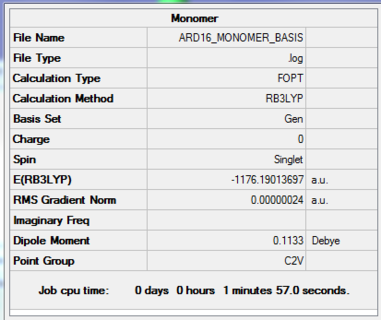Item Value Threshold Converged? Maximum Force 0.000008 0.000450 YES RMS Force 0.000005 0.000300 YES Maximum Displacement 0.000036 0.001800 YES RMS Displacement 0.000023 0.001200 YES