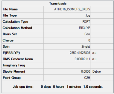 Item Value Threshold Converged? Maximum Force 0.000006 0.000450 YES RMS Force 0.000002 0.000300 YES Maximum Displacement 0.000065 0.001800 YES RMS Displacement 0.000028 0.001200 YES