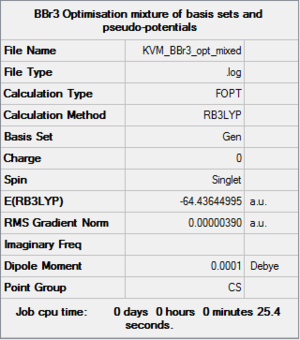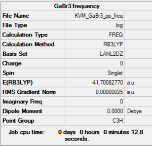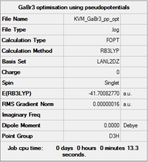 A molecule of GaBr3 was generated in GaussView. The symmetry of the molecule was constrained to the D3h point group with very tight tolerance. A medium level basis set (LanL2DZ) was chosen for the optimisation and the same B3LYP method used. The higher level basis set was required for this optimisation because Ga and Br are both third row heavy atoms. The Lan2DZ basis set uses pseudo-potentials on heavy elements. This means the core electrons are assumed not to be involved in bonding and so are using a pseudo-potential function.