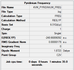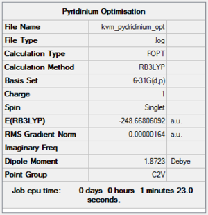 On the optimised .log file of benzene, one carbon atom was replaced by a nitrogen atom and the entire complex assigned a charge of +1 so that it too is isoelectronic with benzene and boratabenzene. The molecule was optimised at the B3LYP/6-31G(d,p) level with tight convergence.