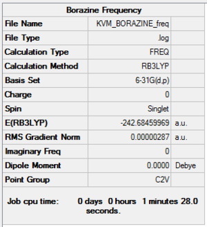 In the charge distribution above and the natural population summary below, it can be seen than all the N-H units are identical and all the B-H units are identical, confirming the 3-fold symmetry. The hydrogen atoms attached to the more electronegative nitrogens are positively charged, while those bonded to electropositive boron are negatively charged. The charges are distributed over a much larger range in borazine than the other molecules studied because of the large difference in electronegativites between nitrogen and boron.