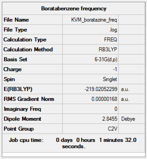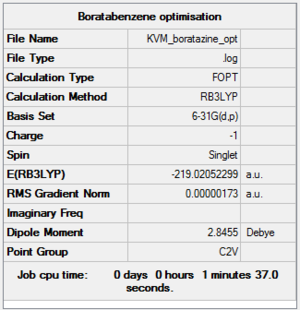 On the optimised .log file of benzene, one carbon atom was replaced by a boron atom and the entire complex assigned a charge of -1. The molecule is isoelectronic with benzene. It was optimised at the B3LYP/6-31G(d,p) level with tight convergence.