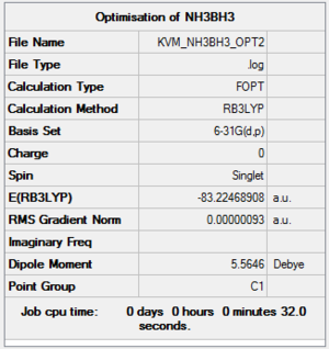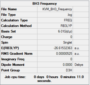 A molecule of BH3 was generated in GaussView. The three B-H bonds were set to different lengths to break the symmetry of the molecule: 1.53 Å, 1.54 Å and 1.55 Å. The molecule was optimised in Gaussian using the B3LYP method and 3-21G basis set. The results from the optimisation are given below.