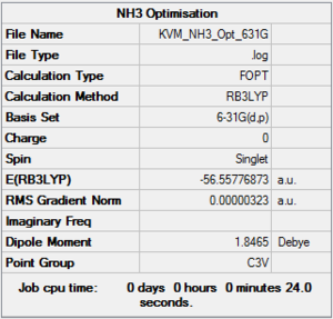 A molecule of NH3 was created and optimised using the B3LYP method and 6-31G(d,p) basis set.