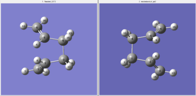 However, the optimization calculation using the QST2 method failed to give the boat transition state, but giving a dissociated chair transition state. Therefore, the structure of both reactants and products need to be adjusted as below.
