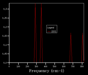 After obtaining the phonon dispersion curve, density of states (DOS), which is the no. of occupied vibrational level at a particular frequency, can be calculated. It simply sums over all the k points at a particular frequency. Comparing the DOS for 1x1x1 grid for a single k value and the phonon dispersion curve, one can work out that the symmetry point L (1/2 1/2 1/2) is the corresponding k point. Figure 3. shows four distinct peaks with frequencies around 280 cm-1, 350 cm-1, 680 cm-1 and 800 cm-1 respectively. The fact that two peaks double the intensity of the other two indicates that there should be two sets of degenerate bands in the dispersion curve. The suggestion can be confirmed by checking the log. file data.