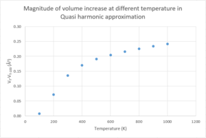The reason for the differences is because in molecular dynamics, temperature is used to compare with the temperature of the system at certain energy level. Yet, it does not contribute to any calculation process. Therefore, in molecular dynamics, the volume of the crystal expands as temperature increases, but the magnitude of increase has no correlation to temperature (see Figure 13). As a result, the thermal expansion coefficient, which contains a term of the change in volume with respect to temperature, does not correlate to temperature either. In contrast, in Quasi harmonic approximation, the Helmholtz free energy of the system is computed with consideration of the temperature input (refer to equation 9). This gives a temperature dependence to the volume of the crystal computed and the magnitude of volume increase. Therefore, the Quasi harmonic approximation results in a positive trend in the change in volume with respect to temperature (see Figure 14).