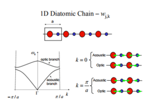 A dispersion curve can be plotted to represent the phonon frequency of a given k vector. The range must be able to map the entire reciprocal space for the lattice. Note there are negative vectors but they are always of equal and opposite magnitude to the corresponding positive vector. The monatomic dispersion curve for the 1D diatomic chain show in figure 1 has a dispersion curve represented in figure 2. To reiterate, as the k vector increases magnitude so does its frequency. Acoustic lower due to vibration in phase.[4].