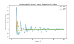 The RDFs of the three physical states (Figure 8) predict the atom density as a function of distance. All the systems have 0 density at distance less than 0.775 Å. The atom density increases rapidly, with a peak value at 1.025 Å for the solid (4.02), 1.075 Å for the liquid (1.96) and 1.125 Å for the gas (2.44). The difference in the peak atom densities reflects the difference in the system's structures. Solids are highly ordered, closely packed with atoms held at fixed positions. Therefore the atom density is much higher than the other systems and is reached at a shorter distance due to more atoms per unit volume. The liquid reaches peak atom density at shorter distance than the gas, since the atoms are mostly clustered together (higher atom density than gas). At long distances, the atom density tends to 1 for all 3 systems since the volume over which density is calculated increases dramatically. The atom density for the gas drops to 1 after a distance of 1.125 Å, which is evidence that the atoms in the system are spaced far apart and hence the system is highly compressible. For the solid, the drop in atom density is much slower and the atom density does not drop to 1 even after a distance of 10. The first 3 peaks for the solid correspond to the 3 nearest neighbour shells and each atom has a coordination number of 24, 6 and 12 respectively. Each peak corresponds to the preferred distance between atoms. The lattice parameter was calculated to be 1.45Å. (See supporting information).