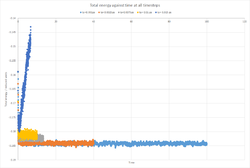 For the optimal timestep identification, the total energy of the system was plotted against time for all the timesteps (Figure 1). The optimal timestep is 0.0025 ps since it converges to the true total energy value. That is true for a timestep of 0.001 ps however smaller timesteps result in longer calculation times which can make demanding calculations very long and expensive and may not simulate the liquid for long enough time therefore 0.0025 ps is chosen instead. Timesteps of 0.0075 ps and 0.01 ps also converge in energy however the energy calculated is higher than that of smaller timesteps. These could give acceptable results at the cost of some inaccuracy in the calculated avergage thermodynamic properties. A timestep of 0.015 ps is not suitable since the total energy increases with time, hence the system energy is not conserved with time which violates the Newtonian Laws of motion.