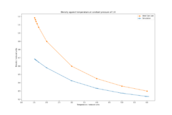 The density decreases exponentially with increasing temperature which is expected since as the temperature increases, the atoms will gain more vibrational energy and therefore the equilibrium bond distances will increase, resulting in larger lattice parameters, hence larger cell volume and lower density. Larger equilibrium distances at elevated temperatures help to maintain the total energy of the system to a minimum as high frequency vibrations can result in unfavourable electronic repulsions in Leonard-Jones systems. Such simulations be used to explain intrinsic properties of materials such as thermal expansion[6]. By comparison of the densities at the 2 pressures, the density is higher at a pressure of 2.5 rather than 1.8 since at higher applied pressures, any system will be compressed (albeit very minimally in the case of solids and liquids), increasing its density. The densities predicted by the ideal gas law are much higher than those of the simulations. The ideal gas law assumes no interactions between the atoms, therefore they can be brought close together without having to pay an energetic penalty as in the case of the Leonard-Jones system. The discrepancy between the predicted densities decreases with temperature since at higher temperatures, the system expands and the atomic interactions become weaker, hence the system begins to behave like an ideal gas.