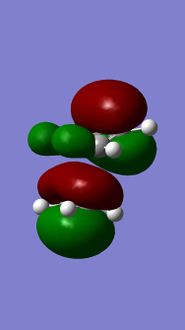 By optimising the geometries of both isomers 1 and 2, their total energies are calculated as 133.42 and 142.31kJ/mol, respectively, and thus, these values suggest that the endo-product is less stable and yet it is preferred in Diels-Alder reactions. The preference for endo-stereochemistry is observed due to secondary orbital interactions between the HOMO of the diene and the LUMO of the dienophile. This interaction does not lead to the formation of new bonds but contributes to the stabilisation of endo-transition state with respect to that of the endo-one, suggesting that it is formed under kinetic control if the Diels-Alder reaction is irreversible. The exo-dimer is more stable thermodynamically because it appears less sterically hindered and so is said to be formed under thermodynamic control.
