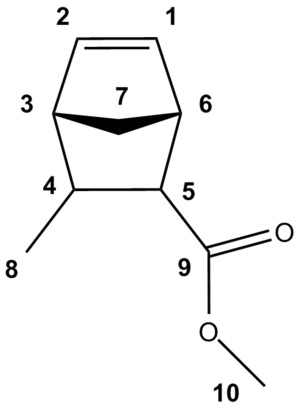 To check this, Janocchio was used to estimate the size of the interactions that might be seen. These were found to be small, and of a similar magnitude in the two cases. For endo (B to C), the NOE value estimated was -0.0106. For exo (A to D) the NOE value was given as -0.0099. With no values literature to compare to here, it is difficult to determine how accurate these calculations are, but they do suggest that NOESY might be applicable and useful to other molecules of this sort to aid determination between exo and endo isomers.