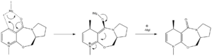 In this reaction, a proline derviative is reacted with a simple Grignard reagent (MeMgI). This reaction is highly regio and stereoselective. This is, in large measure, due to the manner in which Grignard reagents coordinate to the oxygen of the carboyl unit [4]. The mechanism by which the reaction proceeds can be seen in the diagram below.