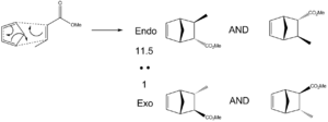 Experimentally however, the endo product generally predominates. This means that the reaction must be under kinetic rather than thermodynamic control. The reason for this is that, as the molecules approach one another, their respective orientations are determined by interactions between the orbitals of the two cyclopentadiene molecules. This can be viewed in terms of frontier orbitals [3].
