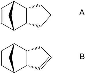The isomers have been reported to react unusually slowly. The explaination for this is that both isomers are examples of hyperstable alkenes [6]. This is due to the presence of a bridgehead carbon-carbon double bond incorporated into the ring system. This consideration only applies in a ring system of a suitable size [7], where the alkene has less strain than the coresponding alkane. This stability makes compounds of this type very slow to react.