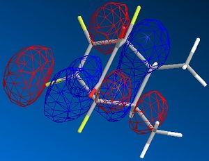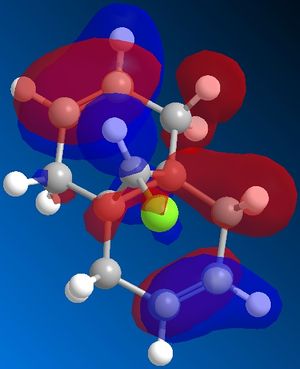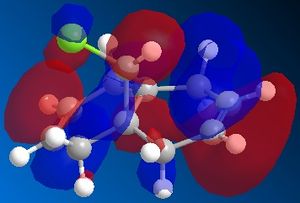 From the moleucular orbitals it may be said that the the above reasoning for the regiochemistry is justified. It can be seen from HOMO that there is more electron density on the syn-alkene and therefore that this is infact more electron dense. It can also be said that the the C-Cl σ* orbital is in the LUMO+1 and the stabilising π orbital of the anti-alkene is in the HOMO-1. NB it can be seen that there is a descrapancy with Rzepa et al here as the C-Cl σ*is part of the LUMO+2 but here is the LUMO+1. This will be due to the differnt type of calcuation sued (Rzepa et al used the PM3 instead of PM6) and differnt absolute conformations of moleucles used at the start of the minimisation process.