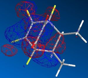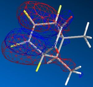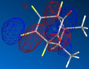 From the above mechanism it can be seen that the reaction may proceed via the endo or exo pathway, it can be seen from the bellow calcualtions show that the thermodynamicaly favoured product is the exo product, 59.772kcal/mol over the endo product, 59.623kcal/mol (nb caclulated using MM2). This is, as stated in the literature, the reverse of what would normally be expected of a deils alder reaction. The moleuclar orbitals (HOMO-1 to LUMO+2) were then calcualted with the same method as in previous part to try and explain the deviation from the expected product configuration. This it may be said is due to the delocalisation in general of electron density, as can be seen from the molecular orbitals below, particually in the case of the HOMO there is overlap of a pi nature between the pi c=c and the sigma c-c bond between thefore stabilisng the exo over the endo. It can also be said that the endo product would be normally be expected to form because of the fact that there will be secondar orbital interactions in the transition state which will be present in the endo and not the exo, namly the stabilisation of the LUMO orbital of the quninone with the HOMO of the cis but-2-ene, which is antibonding in nature, therefore increasing the stability of the endo trasition state over the exo and therefore favoring the product to be endo.