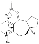 In the reaction of methyl magnesium iodide (MeMgI) with N-methyl pyridoxazepinone 5, Shultz et al[12] postulated that the electropositive Mg atom of the Grignard reagent[11] coordinates to the electronegative O atom of the amide functionality, as shown on the right. Coordination then allows conjugate delivery of the Me group to the top face of the adjacent C-4 position on the pyridinium ring via nucleophilic addition to generate the observed product with high regio- and stero- selectivity.