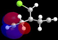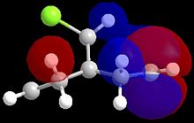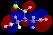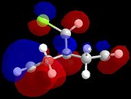 From MO theory, the LUMO and LUMO+1 orbitals are expected to be π* orbitals, and Rzepa et al reported that the LUMO+2 is the C-Cl σ* orbital[25]. However, the results obtained in this exercise showed LUMO and LUMO+2 orbitals to be π* orbitals, and the LUMO+1 orbital to be the C-Cl σ* orbital. This discrepancy can be attributed to the flat conformation of the molecule obtained in this exercise versus the puckered version reported by Rzepa et al[25], which results in increased symmetry. Hence, orbital mixing between the anti-alkene orbital, the C-Cl σ* orbital and another higher energy σ* orbital can occur to stabilise both the 'anti-alkene orbital and the C-Cl σ* orbital, thus lowering the energy of both orbitals with respect to the other π and π* orbitals respectively.