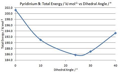The geometry of N-methyl pyridoxazepinone 5 was optimised with respect to the dihedral angle between the O atom of the amide C=O functionality and the C-4 position of the pyridinium ring. A graph was plotted to determine the optimal angle at which the total energy of 5 is minimal. As shown in the graph on the left, the optimal dihedral angle between the O atom of the amide functionality and the C-4 position on the pyridinium ring is 23.8o, with the C=O bond pointing above the plane of the ring.