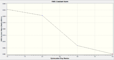 Geometric optimisation aims to simulate the most stable geometric structure of a molecule that give a balance between attractive and repulsive forces. To achieve this, the starting structure will first be analysed to determine the net force experienced by the molecule and then modified accordingly. As the energy gap between successive optimisation decreases, the rate of change of energy with respect to the number of iterations (i.e. the gradient of the Energy graph) reduces and approaches 0. When the successive iterations have the gradient changes within 0.001, the calculation terminates.