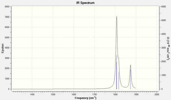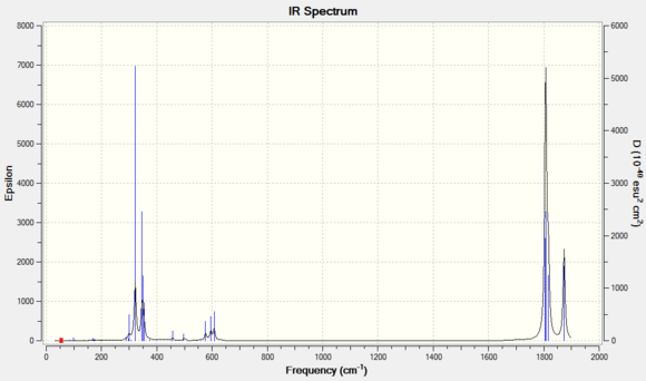For the C=O stretch region of trans isomer, the calculated vibration frequencies is in relatively good agreement with that of literature's, with the values deviates by ~ 50cm-1. This discrepancy may again attribute to the substitution of Cl group for the phenyl group and hence causes the downshift of IR frequencies. Also, there is no literature reported for vibration mode 44 and 45. The intensity reported by the calculated frequencies are small and effectively not visible on an IR spectrum.