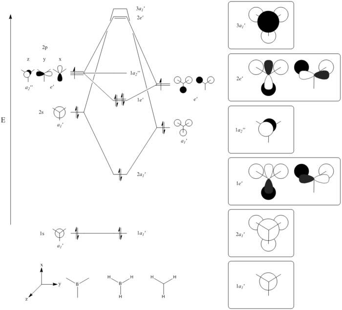Theoretically, the molecular orbitals of BH3 can be predicted with Linear Combination Atomic Orbital (LCAO) approach. LCAO is the quantum superposition of atomic orbitals and generates new molecular orbitals in quantum chemistry where two atomic orbitals with similar energies and symmetries are likely to combine and generate a new bonding and antibonding orbital. Using the LCAO approach, a molecular Orbital Digram of BH3 can be generated and depicted as shown in Fig.2.2.1.