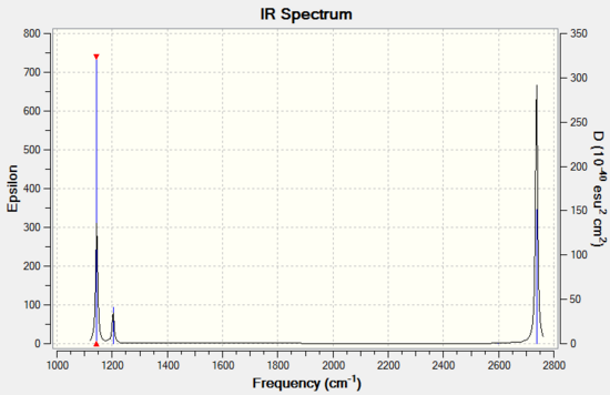 In the IR spectrum, there are a total of 3 peaks found at 1144.15cm-1, 1203.64cm-1 and 2737.44cm-1 respectively. Two of the three peaks are doubly degenerate vibration sets (at 1203.64cm-1 and 2737.44cm-1) and the remaining one is a singly degenerate vibration (at 1144.15cm-1). These make up 5 vibrational modes and the last vibrational mode of A1' vibration was invisible on the spectrum due to its symmetric vibrations which has all the dipole moments cancel out each other, resulting in zero IR absorption.