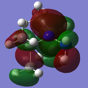 The checkpoint file (.chk) from the optimisation of BH3 was opened and a new Gaussian input file was created for MO analysis. This was submitted to the SCAN for computation. DOI:10042/to-6055 The .chk output file created was used to visualise the MOs. The molecular orbitals labelled 1-8 are shown. Looking at the MOs, it can be seen that the unoccuppied orbitals are more diffuse than the occupied ones, owing to the fact that they are of higher energy. Some orbitals also look slightly odd, such as MO 6.
