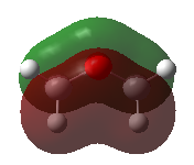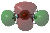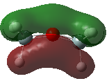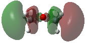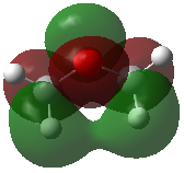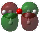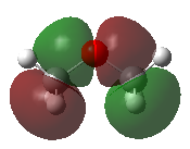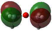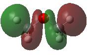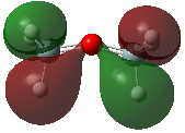 The molecular orbitals of the two compounds are shown above. The precise ordering of the lower energy orbitals varies but in general the orbital shapes are very similar and correlate well with the qualitative molecular orbitals. The molecular orbitals for dimethylether (MO 1, 7 and 8) suggest a that there is a bonding interaction between the two carbon nuclei. This can be rationalised as a result of the higher bond angle bringing the two carbon nuclei closer together. This increases the orbital overlap and the interaction between the carbon nuclei, producing MO's with electron density between the two nuclei. No direct evidence is observed for the proposed p-d bond although MO's 7 and 8 do have the correct symmetry for overlap with a d-orbital and so have the potential for this interaction to occur. If this interaction is present in these molecular orbitals it is likely to be a small perturbation to the orbitals predicted in the qualitative MO diagram. The klopman-salem equation states that the stabilisation energy is inversely proportional to the difference in energy between the two orbitals. In this case the energy difference between the HOMO and the Si d-orbitals is likely to be rather large and so the interaction will cause only a small stabilisation of the orbitals.