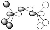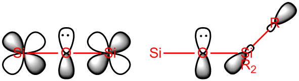 Potential orbital overlap in siloxane bond. Lone pairs in Oxygen p-orbitals can donate either into a Silicon d-orbital (left) or Si-R σ* orbital(right).