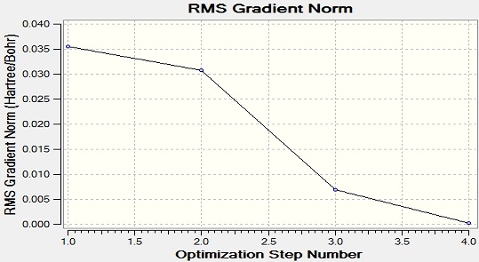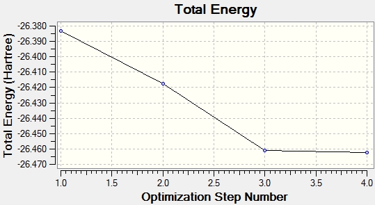 The table above summarises the steps taken during the optimisation procedure. After each step the nuclei are moved and the energy is determined. This is repeated until the structure arrives at an energy minimum.