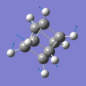 Cubane was built via the template in ChemBio3D, and then edited in GaussView such that all C-C bonds measured 1.5727 Å and all C-H bonds measured 1.118 Å[2]. To optimize this structure a DFT-B3LYP/6-31G(d) optimization was run on this structure.