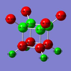 Simply on the basis of electronegativity one would expect the carbon atoms to be electron-rich (Χ(C) = 2.55; Χ(H)= 2.20[5]) - this is indeed the case. The precise distribution is displayed in Fig. 3.1.4.1. What can be inferred from this distribution is that the carbons in cubane should be vulnerable to electrophilic attack, and resistant to nucleophilic attack. Whether or not cubane is reactive in reality will be influenced by the charges, but will depend mostly on the presense of orbitals of suitable symmetry and energy that are able to interact with suitable orbitals on the electrophile (or nucleophile).