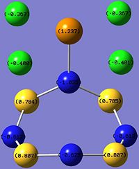 The charge distribution of TeCl4.S4N4 is also useful for studying the effect of coordination on S4N4. A polarisation effect of TeCl4 coordination is the accumulation of positive charge density (+0.298) in the S4N4 ring, which was neutral overall in uncoordinated S4N4. In addition, the distribution of charge is no longer uniform, unlike uncoordinated S4N4.