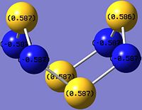 Another interesting point to note is that the Cl atoms above the S4N4 ring have higher negative charge density (-0.401) compared to those pointing away from the ring (-0.367), which can be explained by the accumulation of positive charge density about the S4N4 ring. This is supported by addition of the charge distribution around the entire S4N4 ring to get a net +0.298 for the ring.