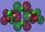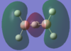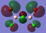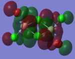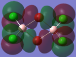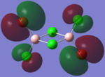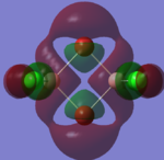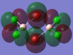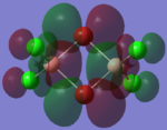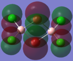 The bridging bonds between boron and bromine have already been shown to be longer bonds. The B-Br bond has the majority(72.25%) of the electron density situated of the the bromine, again this is expected because bromine is more electronegtive than boron. The hybridisation of the boron and bromine atoms B-Br bond is sp4, which is not expected as the p orbital contribution is too large. When the polarity of the atoms involved in both the terminal and bridging bonds are compared it can be seen that the value for bormine is larger than for Chlorine. Again this is unexpected because chlorine is more electronegative then bromine and should have a larger share of the electron density than bromine.