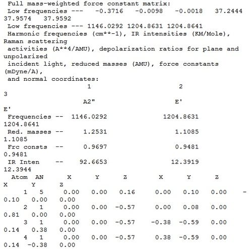Low frequencies --- -3.4213 -0.0026 -0.0004 0.0015 3.9367 3.9367 Low frequencies --- 46.4289 46.4292 52.1449 Harmonic frequencies (cm**-1), IR intensities (KM/Mole), Raman scattering activities (A**4/AMU), depolarization ratios for plane and unpolarized incident light, reduced masses (AMU), force constants (mDyne/A), and normal coordinates: 1 2 3 E' E' A2" Frequencies -- 46.4289 46.4292 52.1449 Red. masses -- 88.4613 88.4613 117.7209 Frc consts -- 0.1124 0.1124 0.1886 IR Inten -- 3.6867 3.6867 5.8466 Atom AN X Y Z X Y Z X Y Z 1 81 0.00 0.28 0.00 -0.28 0.00 0.00 0.00 0.00 0.55 2 35 0.00 0.26 0.00 0.74 0.00 0.00 0.00 0.00 -0.48 3 35 0.43 -0.49 0.00 -0.01 -0.43 0.00 0.00 0.00 -0.48 4 35 -0.43 -0.49 0.00 -0.01 0.43 0.00 0.00 0.00 -0.48