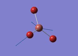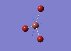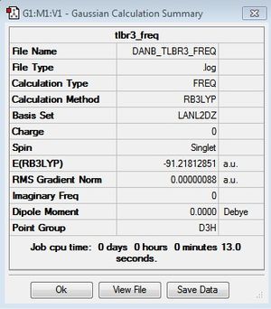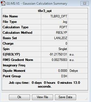 Our investigation will now be extended to a heavier trigonal planer molecule (TlBr3) and the effect of a heavier atom will be explored. The fact that TlBr3 has more electrons will result in more complicated and longer calculations. In order to minimize possible limitations we will solely model the valence electrons responsible for bonding and use an improved basis set to account for the complex electronic structure. The improved basis set that was chosen was a compromise between best description of electronic structure and computational time constraints. Thus, the LanL2DZ basis set fitted these criteria, providing a medium sized basis set for first row atoms and a pseudo potential for heavier atoms. The geometry optimization will involve the same method outlined previously (DFT B3LYP). The optimization begins from a restricted D3H trigonal planer structure. We restrict the symmetry to ensure no splitting of frequencies, ensuring reliable results, minimizing the error. The optimizations summary and the optimized molecule can be seen below.