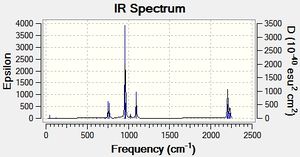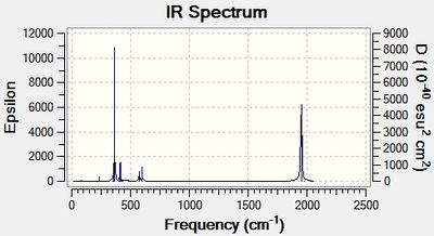 From the above table we can see the higher energy stretching modes at 2730.07cm-1 and 2591.65cm-1. It is important to note that the 2730.07 stretch is degenerate, which is consistent with the e" assignment from the molecular orbital diagram. The IR spectrum can be seen below.