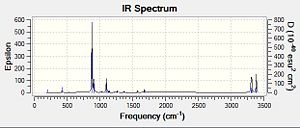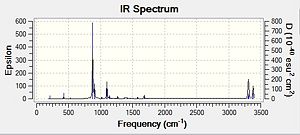 The calculation yielded an energy of -231.60279849 Hartrees and a distance of 2.14Å was found between the terminal carbons of each allyl fragment. This energy is slightly higher than that of the chair structure (chair transition state is more stable by 0.0165239 Hartrees, 43.8 kJ/mol) and this is because the chair is a slightly more stable conformation due to unfavourable interaction between the axial hydrogens present in the boat structure. As a result, the bond distance between the terminal carbons is also a little higher than previously found for the chair structure. An imaginary frequency of 840cm-1 was found. This vibration and the computed IR spectrum can be seen below: