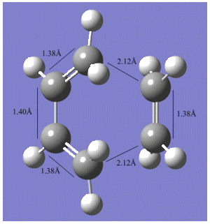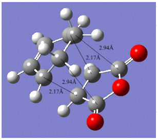Comparison with typical sp3 and sp2 C-C bond lengths, 1.54Å1 and 1.34Å1, indicate that that the C=C bond lengths are in better agreement than the C-C bonds. The partly formed σC-C bond in the transition structure is 2.12Å, which is shorter than twice the van der Waals radius of a carbon atom, 1.71Å, but longer than a typical C-C bond. This suggests that the the van der Waals radii of the terminal carbon atoms are within each other to allow for bond formation, but because it is a transition structure, the bonds have not actually been formed yet.