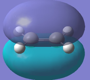 Cis butadiene was drawn and optimised using Gaussview so that the HOMO and LUMO may be plotted. The p orbitals are the atomic orbitals that make up the frontier orbitals in butadiene so these are what we will consider. We will look at the symmetry of the HOMO and LUMO of cis bitadiene as well as ethylene to see which can react with each other, only symmetric orbitals can interact with symmetric orbitals and antisymmetric orbitals with antisymmetric orbitals. An orbital is considered symmetric if it has a plane of symmetry down the central bond of the butadiene molecule. There are 4 ways in which the p orbitals of the substituent carbon atoms may be arranged, they are shown below. Note the the number of nodes refers only to the nodes between p orbitals, obviously there is also one more nodal plane in each MO along the plane of the molecule through the middle of the p orbitals.
